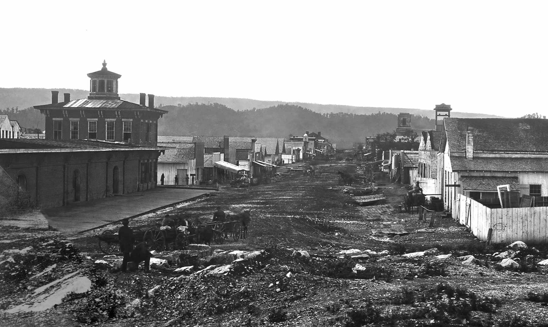 Likely taken in the first months of Union occupation, this view up Market Street reveals a rather depressing scene. Large boulders jut from the earth. A man sits on a rock , head down, as if to be pondering his unfortunate venue. Perhaps he could pick up a nice souvenir at the DEPOT SHOPS across the street.