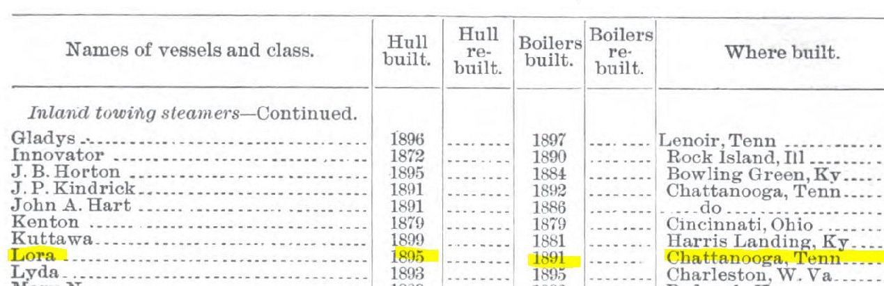 One of the few Chattanooga glass plates is broken diagonally - somewhat along the decking of the newly built ‘county bridge’, now known as the Walnut Street Bridge. The bridge was dedicated February 18, 1891 and was the first non-military highway bridge across the Tennessee River. High water is also apparent in this photo, but doesn’t help date it as minor flooding was a regular occurrence pre-TVA dams. The inland towing steamer ‘Lora’ is moored nearby. Its hull built in 1895. Based on the lack of development, in Hill City (the North Shore), the scene is likely pre-1900.