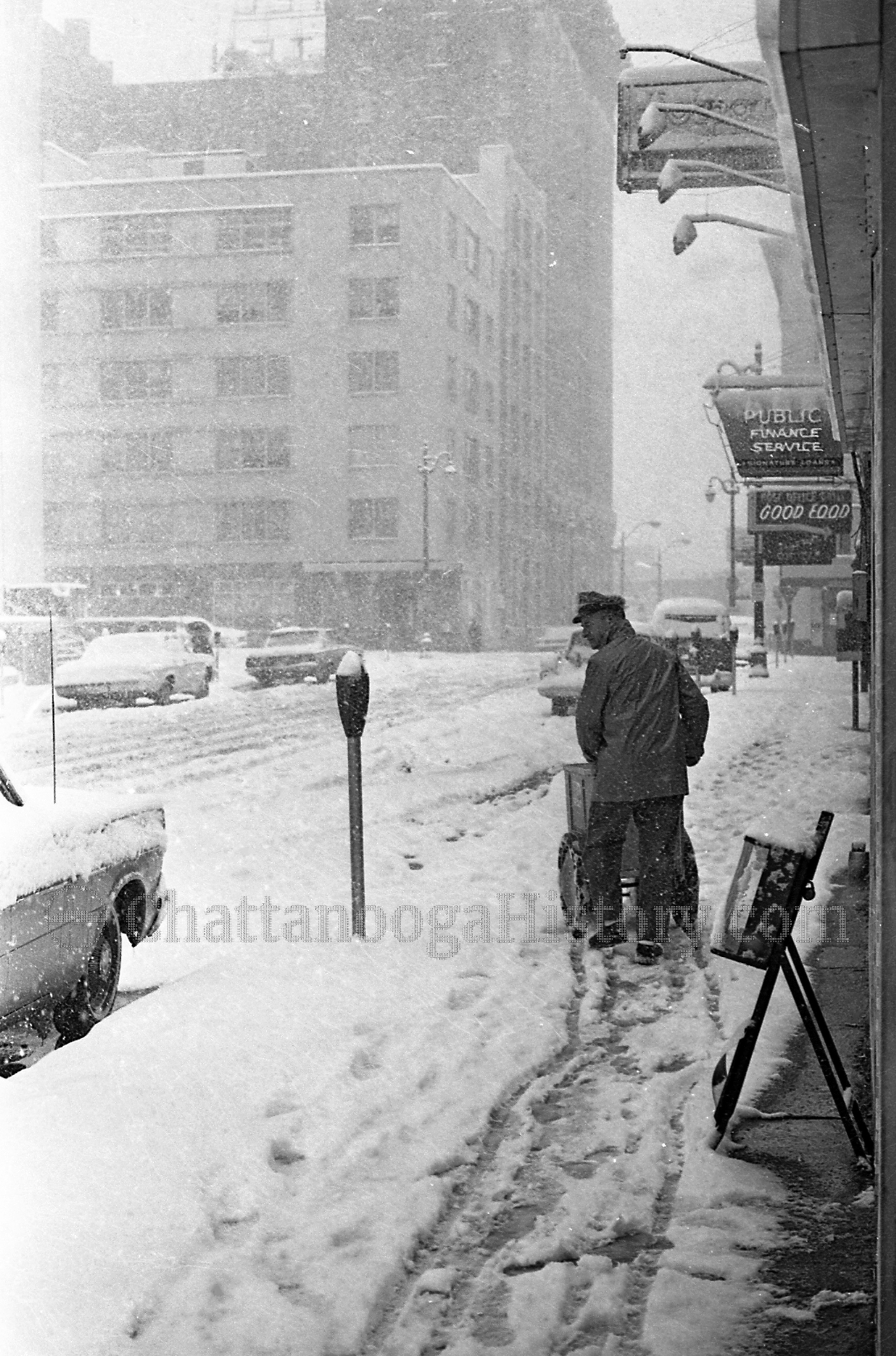 Hugh J. Moore Jr. was 17 years old, and a senior at McCallie when he took these photos. Brilliant colors of Kodachrome slides capture the busy downtown scenes after a late season snowfall.