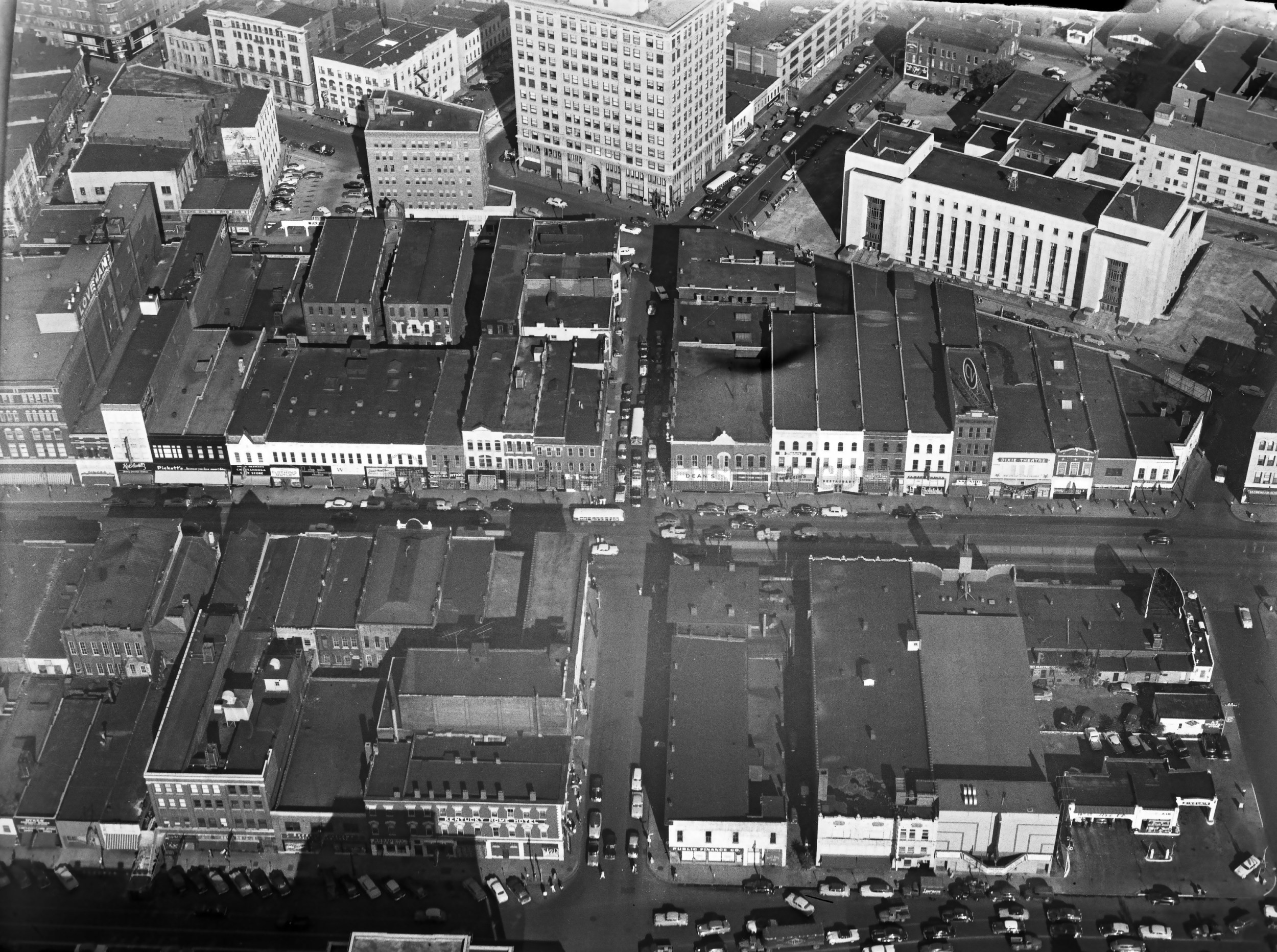 View from 5th St. looking north recalls several car dealers occupied this stretch of a busy retail zone including Newton Chevrolet, Buehler's Food Market, Jack's Army Store and Smith-Owens Rambler.